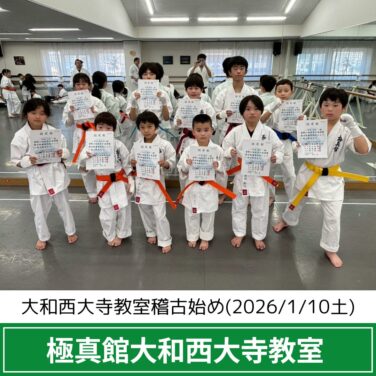 大和西大寺教室の稽古風景 大和西大寺教室稽古始め(2026/1/10土) 大和西大寺教室、稽古始めでした🥋 年末の審査会で昇級したみんなに、新しい帯と認定状を授与! 新しいスタートの一年、さらに成長していきましょう! ------------------------------- 【極真館大和西大寺教室】 奈良フ... 2026.01.10 大和西大寺教室の稽古風景